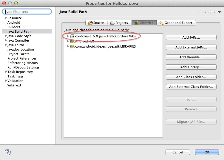 - Copy cordova-1.8.0.jar from your Cordova download earlier to /libs