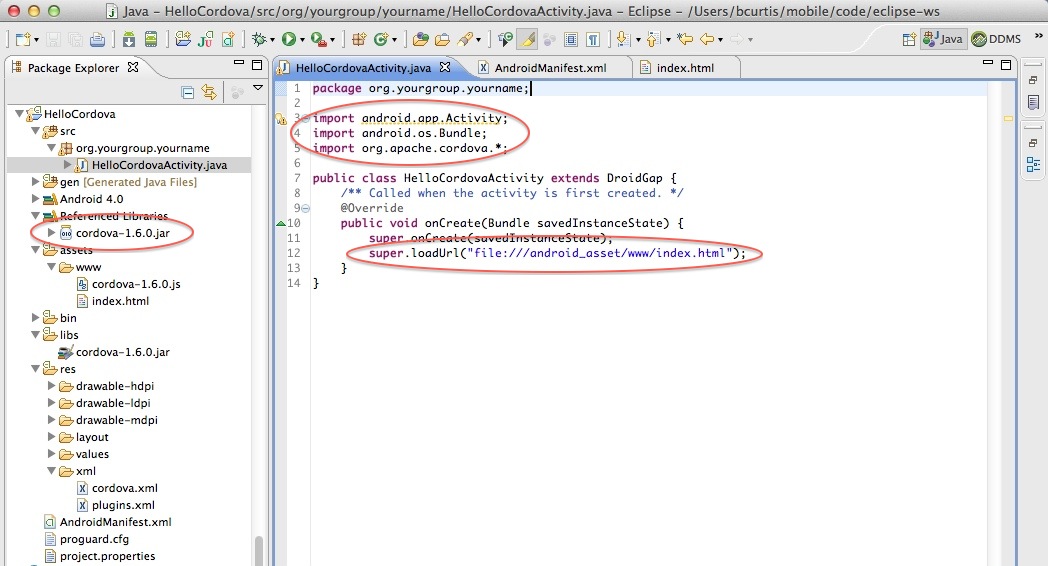 - Copy cordova-1.8.0.js from your Cordova download earlier to assets/www